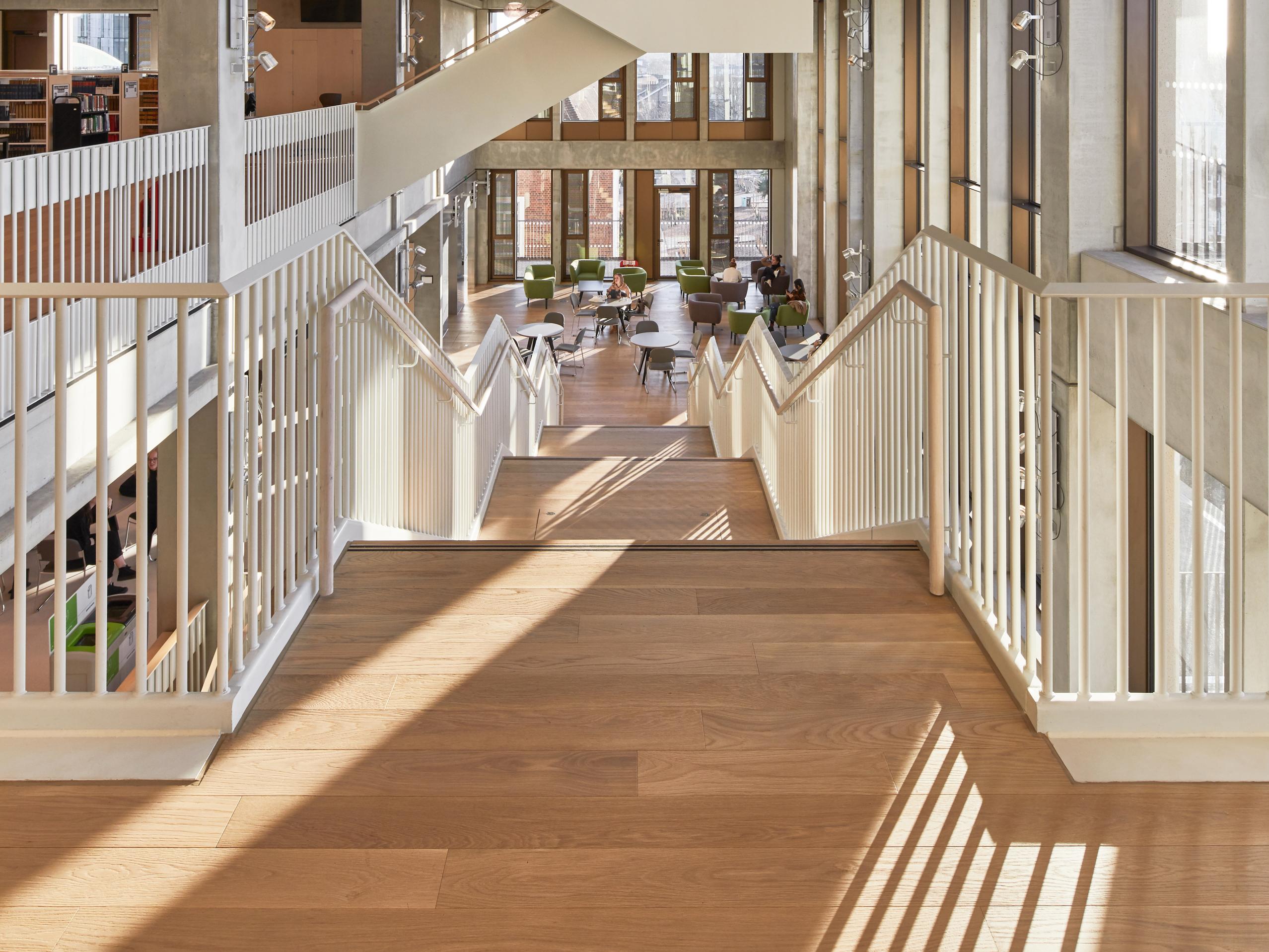 Junckers 140mm Textured Nordic Oak Classic flooring clads the treads and risers of the imposing staircase in the triple height courtyard, as well as providing a hard-wearing floor surface for seating areas.