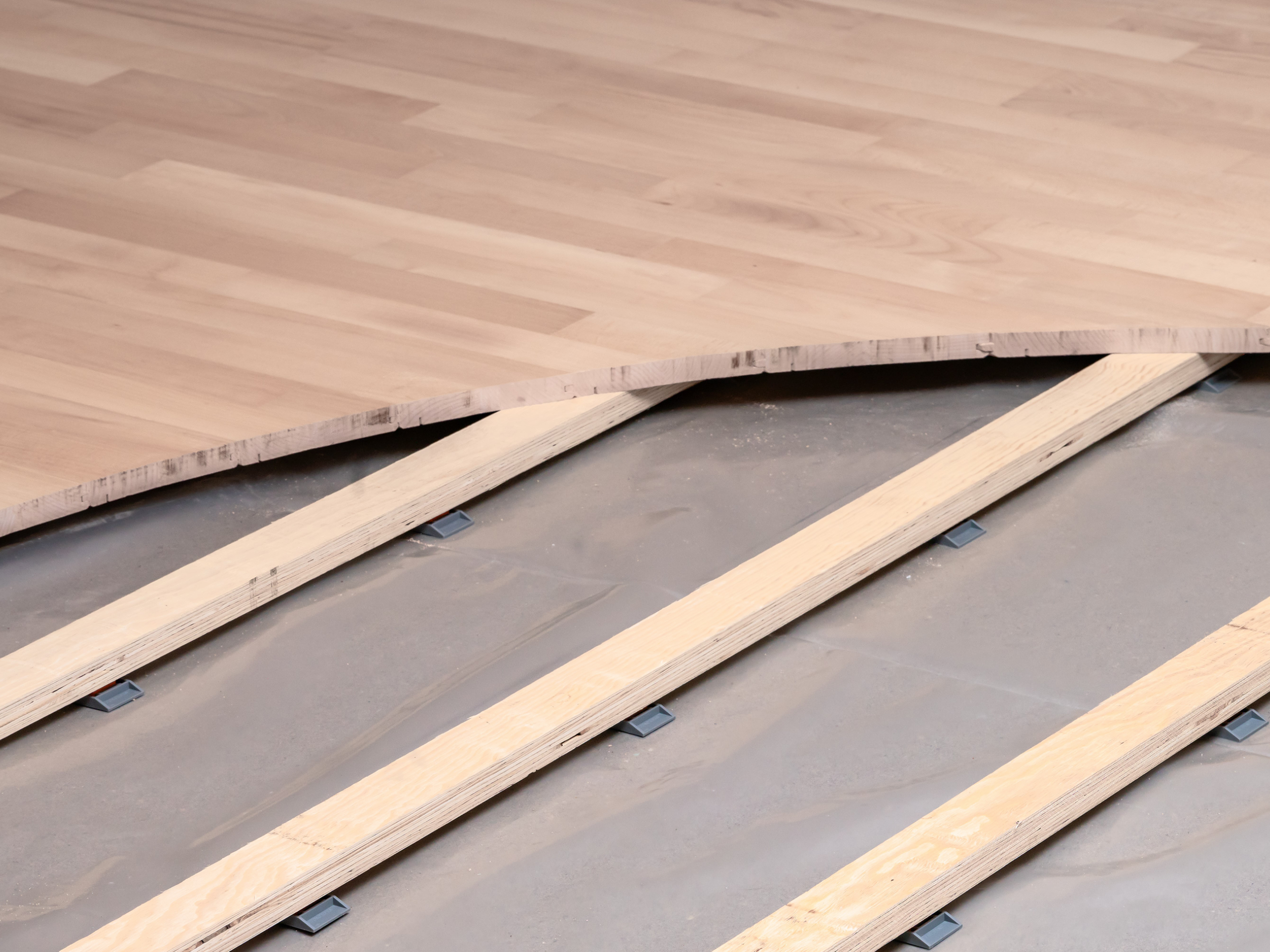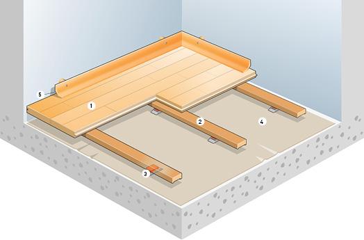 The UnoBat 62+ System provides excellent performance and safety, along with the ability to accommodate all types of irregular subfloors. The 22mm solid hardwood floor boards are fastened to a subfloor system consisting of single layer engineered battens with preattached shock absorbing rubber pads.
